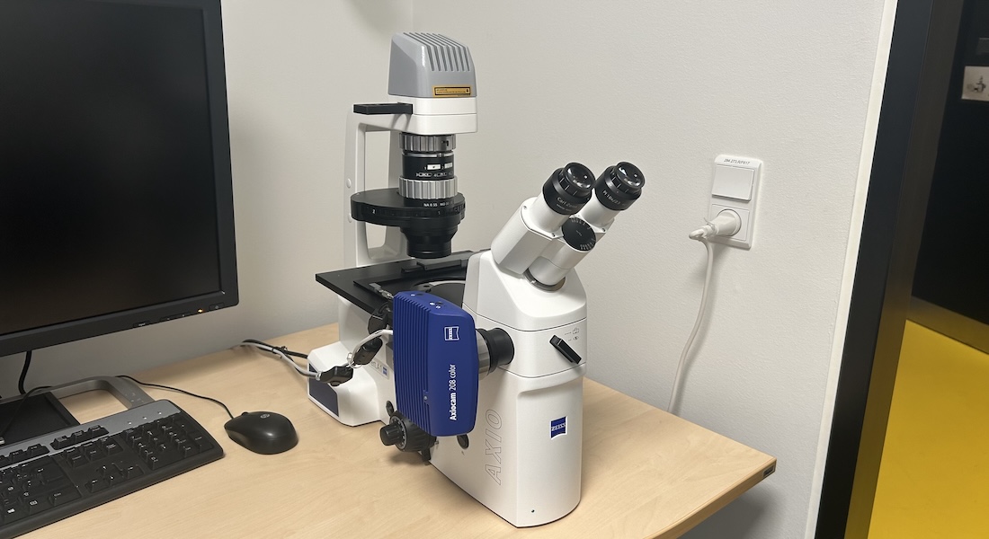 This basic, inverted Zeiss Axiovert Z1 microscope allows you to check your brightfield and fluorescent stainings by using either transmitted white light or LED-based fluorescence excitation (blue, green, red). Additionally, the system boasts phase contrast objectives, that can be used to introduce contrast into unstained samples. The microscope is fitted with an AxioCam 208 color camera, particularly suitable for brightfield imaging. This microscope is ideal if you want to take a few snapshots of your H&E or Sirius red staining, for example, or if you just want to check if your fluorescent staining worked. The phase contrast objectives are ideal to look at unlabeled Prokaryotic or Eukaryotic cells on culture vessels, since the microscope boasts an inverted stand. This microscope does not need to be booked when checking samples by eye, but please do if you will be taking images with it.