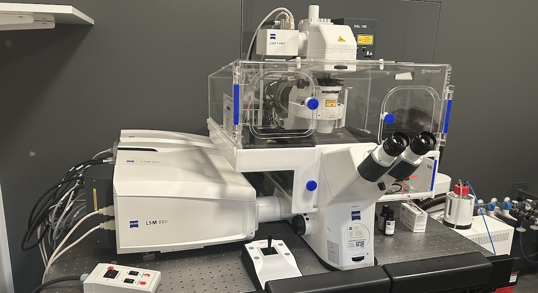 The Zeiss LSM 880 Airyscan is an inverted confocal microscope designed for high-resolution imaging of fixed and live-cell samples. It features a motorized AxioObserver Z1 stand with Definite Focus 1 for focus stabilization, a motorized XY stage for precise positioning and tiling, and a fully enclosed chamber for environmental control during time-lapse experiments.