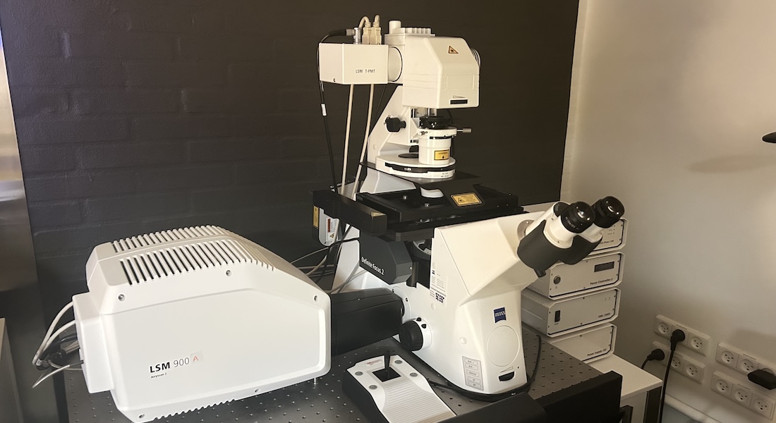 The Zeiss LSM900 is a compact system delivering superb performance for routine fixed sample imaging using a laser scanning confocal. Mounted on an inverted microscope, it enables the scan live cells by using water immersion lenses, a stage-top chamber for environmental control and focus drift correction.