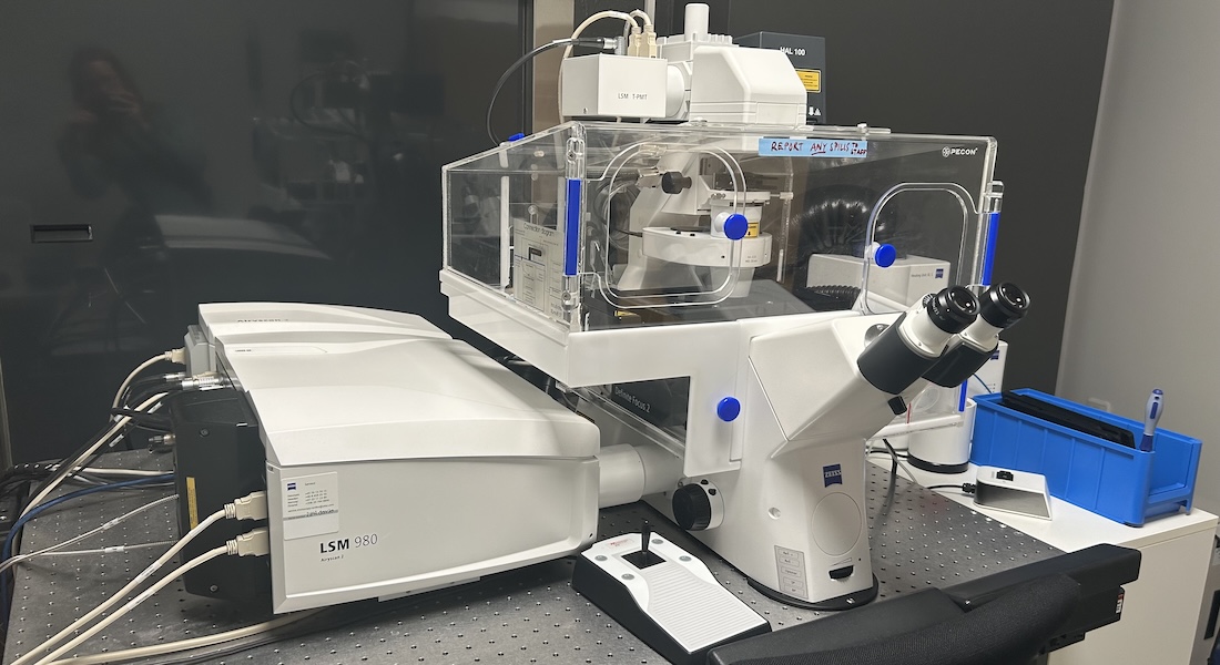 The Zeiss LSM980 system incarnates the newest generation of laser scanning confocal microscopes. Mounted on an inverted microscope for full flexibility and compatibility with live cell imaging (boasting Definite Focus 2 for focal stabilization and cell incubation chamber), it is also amenable for standard fixed sample imaging.