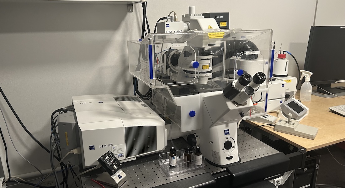 LSM780 is an inverted laser scanning confocal microscope equipped for live imaging (temperature and CO2 control). It has a tunable laser giving it a high flexibility in fluorophore excitation. The GaASP detector allows for detection of faint stainings and spectral imaging (separation of spectrally overlapping fluorophores).